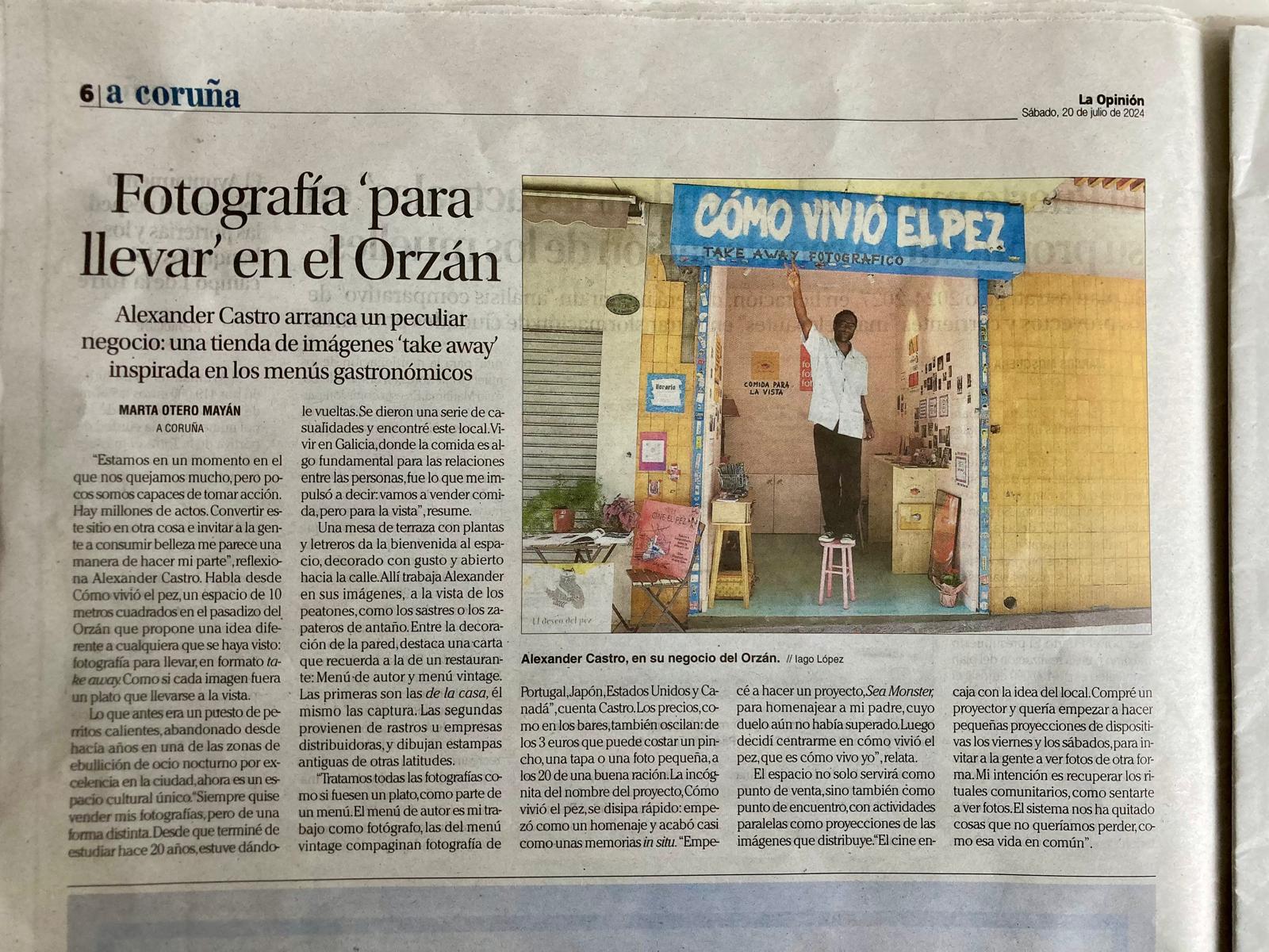 From that vision came Cómo vivió el pez, an artistic and social project based in the heart of Orzán (A Coruña, Spain), my neighbourhood. In this space, I exhibit my own work — with photographs that people are invited to touch — while also opening the doors to the community, turning it into a cultural meeting point. The project is part of a wider grassroots effort to transform the area: what was once an abandoned hot dog stand, in the middle of one of the city's main nightlife zones, is now being reimagined by local collectives as a space for diverse cultural expression.